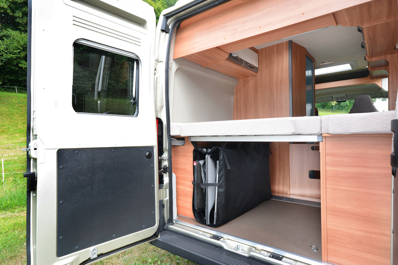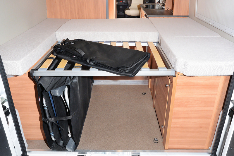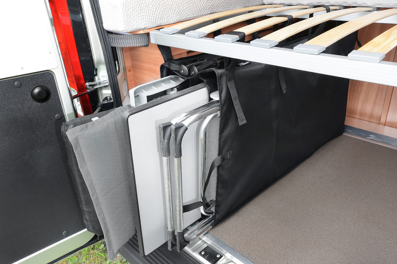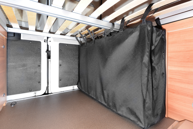 Mit der Zoombox 2 kommt Ordnung in die Garage Ihres Kastenwagens. Leichte Montage unter dem Heckbett. 3-fach unterteilt für Tisch und Stühle. Ideale Raumnutzung. Extrem reissfestes Kunststoffgewebe. Schmutzunempfindlich und abwaschbar.